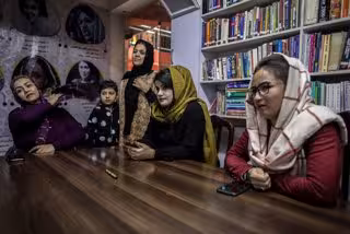 Archivo - 08 November 2022, Afghanistan, Kabul: Julia Parsi (L) sits with other founders of the "San Library," the "women's library" in the Afghan capital Kabul. Since taking power in August 2021, the militant Islamist movement of Taliban have been mass