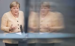 07 September 2021, Berlin: German Chancellor Angela Merkel delivers her speech during a plenary session at the German Bundestag. Photo: Michael Kappeler/dpa