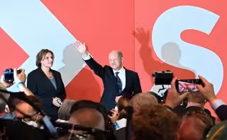 26 September 2021, Berlin: Olaf Scholz, Federal Minister of Finance and candidate of the Social Democratic Party (SPD) for Chancellor, waves next to his wife Britta Ernst during the 2021 German Parliamentary election at Willy Brandt House. Photo: Britta