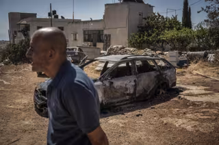 Archivo - Imagen de archivo de un palestino junto a un vehículo calcinado en un ataque de colonos israelíes.