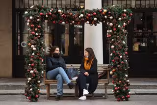 26 November 2020, England, London: Two women sit on a bench festively decorated with the Christmas Baubles, in Covent Garden. Photo: Yui Mok/PA Wire/dpa - Yui Mok/PA Wire/dpa