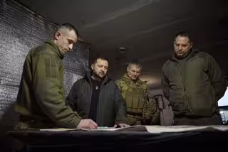 December 29, 2023, Avdiivka, Donetsk Oblast, Ukraine: Ukrainian President Volodymyr Zelenskyy, center, is briefed by brigade commander Mykola Chumak, left, during a visit to the 110th Separate Mechanized Brigade along the frontlines of the Donetsk regio - Europa Press/Contacto/Pool /Ukrainian Presidentia