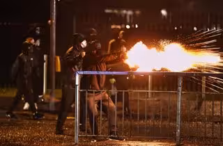 08 April 2021, United Kingdom, Belfast: Rioters fire fireworks at the anti-riot police on the Springfield road, as unionists and nationalists clashed with the police and each other. Photo: Liam Mcburney/PA Wire/dpa