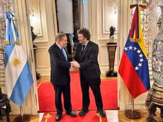 "Gracias por venir y gracias por estar en nuestra casa porque Argentina siempre es la casa de los venezolanos de bien", ha declarado Milei durante el apretón de manos inicial con el opositor venezolano, mientras cientos de compatriotas de la diáspora se concentraban en la Plaza de Mayo para celebrar lo que la oposición venezolana considera como una visita de Estado.