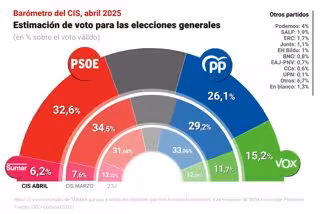 El Barómetro de Opinión del Centro de Investigaciones Sociológicas (CIS) correspondiente al mes de abril refleja una caída de dos puntos en las expectativas del PSOE, que se anota un 32,6% de estimación de voto, pero aún así amplía a 6,5 puntos su ventaja sobre el PP, que pierde todavía más y marca su peor dato en estas encuestas (26,1%).