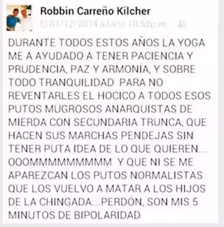 "Durante todos estos años la yoga me ha ayudado a tener paciencia y prudencia, paz y armonía y, sobre todo, tranquilidad para no reventarles el hocico a todos esos mugrosos anarquistas de mierda con secundaria trunca, que hacen sus marchas pendejas, sin tener puta idea de lo que quieren...", aseguraba en Facebook Carrera Carreño, según informa la revista mexicana 'Proceso'.