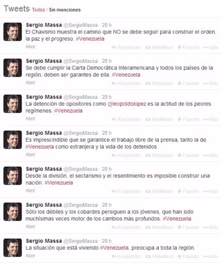 El líder argentino del Frente Renovador y Diputado Nacional por la provincia de Buenos Aires, Sergio Massa, ha criticado al gobierno de Nicolás Maduro y la detención del dirigente opositor de Voluntad Popular, Leopoldo López.