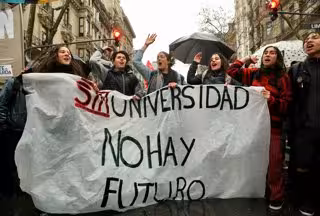 "¡Defender la universidad pública!", se leía en algunos de los carteles de los manifestantes que cantaban contra el Gobierno bajo una intensa tormenta.