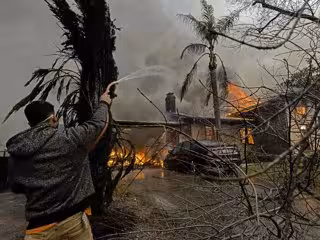 January 10, 2025, Altadina, California, USA: A man uses a garden hose on a fire as businesses and properties were destroyed in the aftermath of the fierce Eaton fires on Wednesday, January 8, 2025, in Altadena, California. NICK UT/PI - Europa Press/Contacto/Nick Ut
