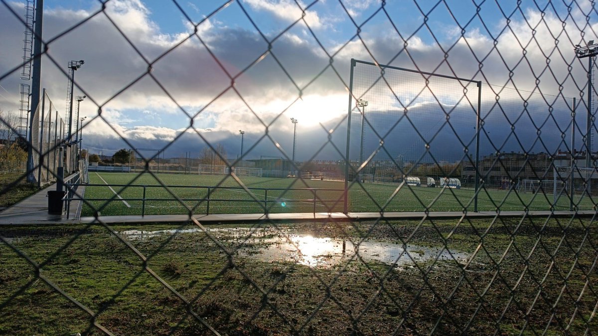 Campo de fútnol de Ávila con algunas zonas encharcadas.