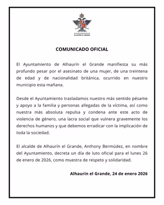 El alcalde del Ayuntamiento de Alhaurín el Grande (Málaga), Anthony Bermudez, ha decretado el próximo lunes, 26 de enero, como día de luto oficial en la localidad "como muestra de respeto y solidaridad" tras un presunto caso de violencia de género que ha tenido lugar este sábado en este municipio del Valle del Guadalhorce y en el que una mujer británica ha sido hallada muerte y su pareja, un hombre español, se ha entregado en la prisión provincial.