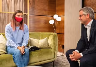 Krystsina Tsimanouskaya, atleta bielorrusa, se encuentra con el ministro de Exteriores austriaco, Magnus Brunner, en el aeropuerto de Viena. - Florian Schrtter/BKA/dpa