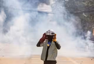 19 March 2021, Myanmar, Yangon: A protester stands in the middle of teargas smoke during a protest against the military coup and the detention of civilian leaders. Photo: Aung Kyaw Htet/SOPA Images via ZUMA Wire/dpa - Aung Kyaw Htet/SOPA Images via Z / DPA