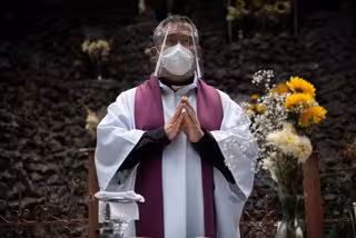 15 January 2021, Bolivia, La Paz: A priest wears a face shield and a mask prays during a service held outdoors at Hospital de Clinicas for health care workers who died from Covid-19. Photo: Radoslaw Czajkowski/dpa