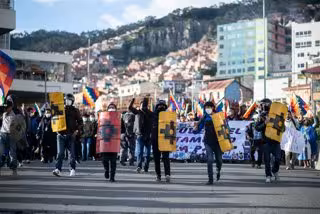 18 March 2021, Bolivia, La Paz: People take part in a pro-government rally demanding the conviction of former interim president Jeanine Anez and her ministers, who were arrested as part of investigations into the forced departure of President Morales at