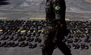 Un soldado brasileño camina junto a las armas incautadas a organizaciones criminales