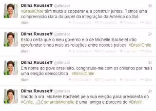 La presidenta de Brasil, Dilma Rousseff, utilizó su cuenta en Twitter para felicitar a la presidenta electa de Chile, Michelle Bachelet, a la que se refirió como a su "amiga y compañera".