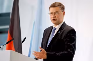 12 September 2020, Berlin: Valdis Dombrovskis, EU Vice-President and Commissioner for Economic and Capital Services, delivers a statement to the media on the second day of the EU Informal Meeting of Ministers for Economic and Financial Affairs. Photo: O