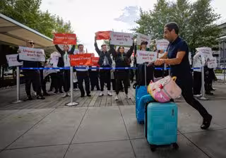 BEIJING, Aug. 17, 2025 -- A traveler walks past striking Air Canada flight attendants at Vancouver International Airport in Richmond, British Columbia, Canada, Aug. 16, 2025. Canada's largest airline Air Canada said Saturday it has suspended all operat - Europa Press/Contacto/Lin Wei