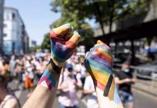 Archivo - 27 June 2020, Berlin: Two participants of "Pride Berlin: Save our Community, Save our Pride" hold up their fists, painted in rainbow colours in support of the LGBT community. Photo: Fabian Sommer/dpa