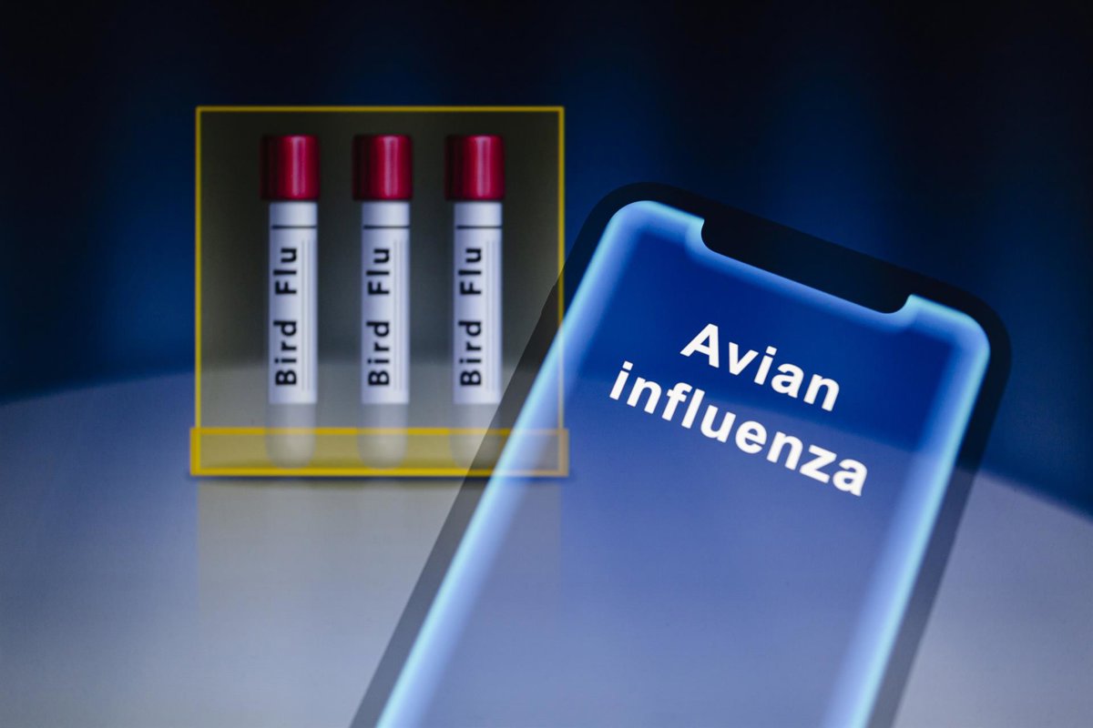 Archivo - February 17, 2023, Asuncion, Paraguay: A view of the words ''avian influenza'' is displayed on a smartphone in front of visual representation of test tubes labeled ''bird flu.'' ''Avian influenza or bird flu refers to the disease caused by inf