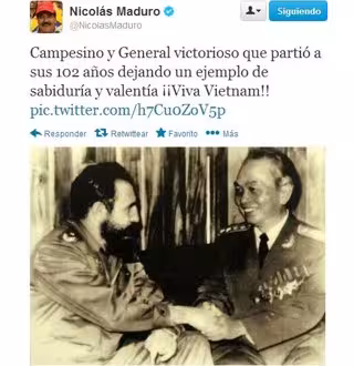 Maduro parecer tener así igual consideración hacia el fallecido general que la que tuvo su antecesor en el cargo, Hugo Chávez, quien cuando en el año 2006 se reunió con Giap en Hanoi, llegó a decirle que había estudiado "profundamente" su pensamiento militar y que "uno de sus sueños" hubiera sido servir bajo su mando, "como un simple soldado en la conquista de la libertad y el socialismo".