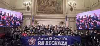 Militantes de Renovación Nacional muestran una pancarta confirmando su rechazo a la nueva Constitución de Chile.
