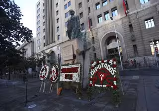 Archivo - 11 September 2019, Chile, Santiago: Flowers lie next to the statue of the then overthrown Chilean President Salvador Allende, on the occasion of the 46th anniversary of the 1973 Chilean coup d'etat. On 11 September 1973, the Chilean military d - Cristobal Escobar/Agencia Uno/dp / DPA - Archivo