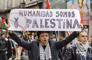 Mujeres tiradas en las calles del centro de la capital, simulando estar muertas por bombardeos, junto a centenares de personas con banderas palestinas y la tradicional 'kufiya' (pañuelo árabe), participaron de la manifestación.