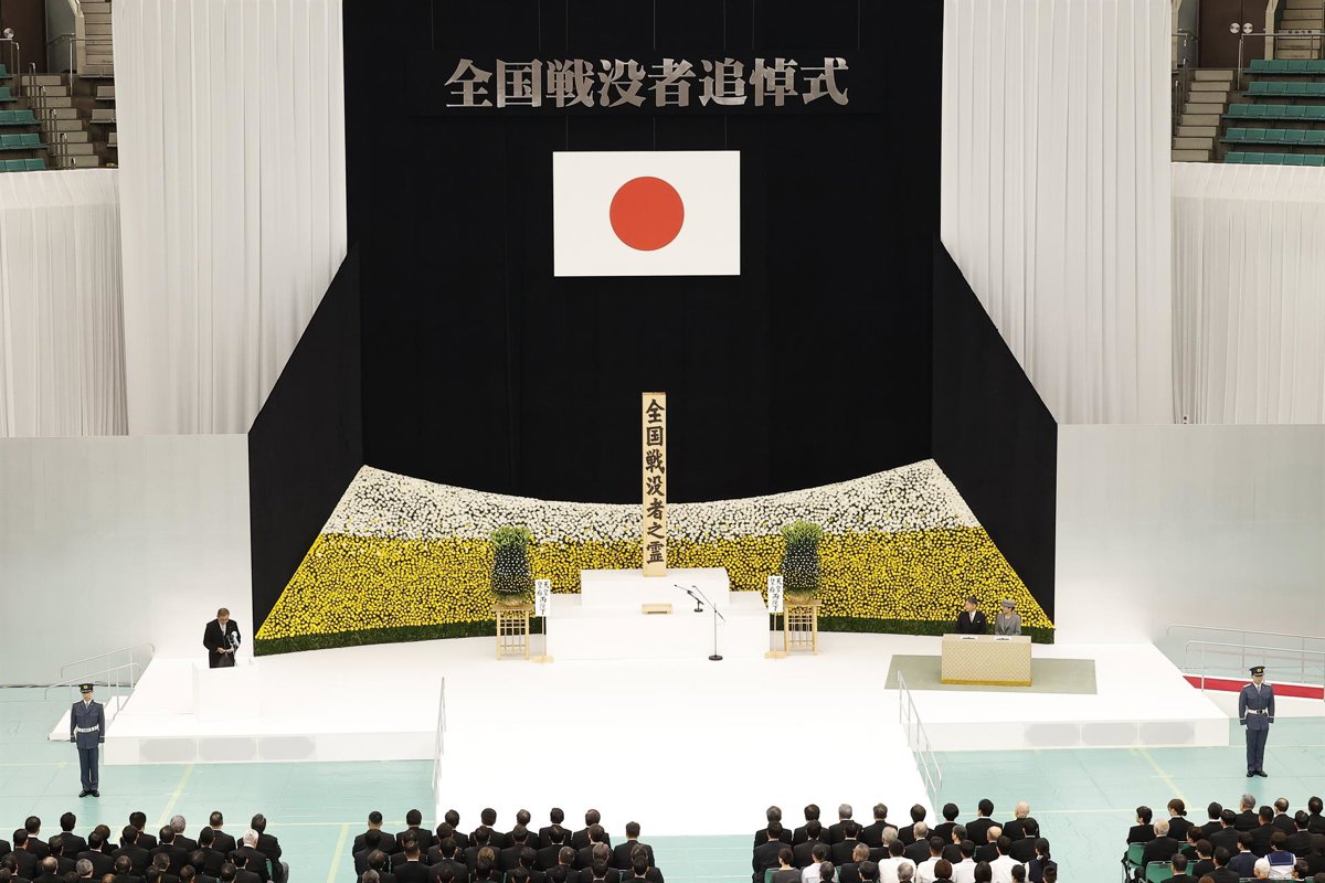 August 15, 2025, Tokyo, Japan: Japanese Prime Minister Shigeru Ishiba (L) delivers a speech during a memorial ceremony marking the 80th anniversary of Japan's surrender in World War II, held at the Nippon Budokan Hall in Tokyo. - Europa Press/Contacto/Rodrigo Reyes Marin