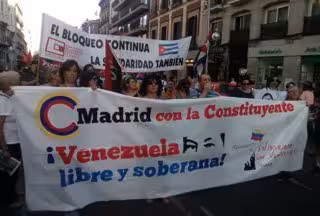 "La Constituyente palante, palante y al que no se guste que se joda y que se aguante", "fuera fascistas de Venezuela", "Felipe González, fascista", "Venezuela no es una colonia", "Alerta, alerta que camina, la espada de Bolívar por América Latina", eran solo algunos de los lemas y consignas coreadas durante la concentración por el centro de Madrid.