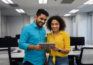 Imagen generada con IA de dos compañeros revisando una tablet en una oficina - UTEL