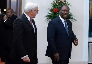 18 November 2019, Berlin: German President Frank-Walter Steinmeier (L), welcomes Alassane Ouattara, President of Cote d'Ivoire, at the Bellevue palace, before a dinner for the leaders participating in the G20 Compact with Africa Conference. Photo: Bernd - Bernd von Jutrczenka/dpa - Archivo