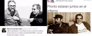 En otro trino, Cabal muestra dos planos aéreos señalando las residencias en La Habana del escritor y del ex presidente cubano con la siguiente explicación: "Mansion de GABO contigua a la del Principe satanico Fidel", mientras junto a otra fotografía de ambos sonrientes y abrazados hace el siguiente comentario: "Tan comico..le habra contado como ordeno asesinar a Gaitan?".