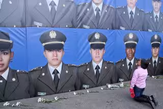 Una mujer se postra ante los retratos de algunos de los reclutas fallecidos tras el ataque bomba del ELN en la Escuela de Policías General Santander, de Bogotá. - Camila Díaz/colprensa/dpa - Archivo