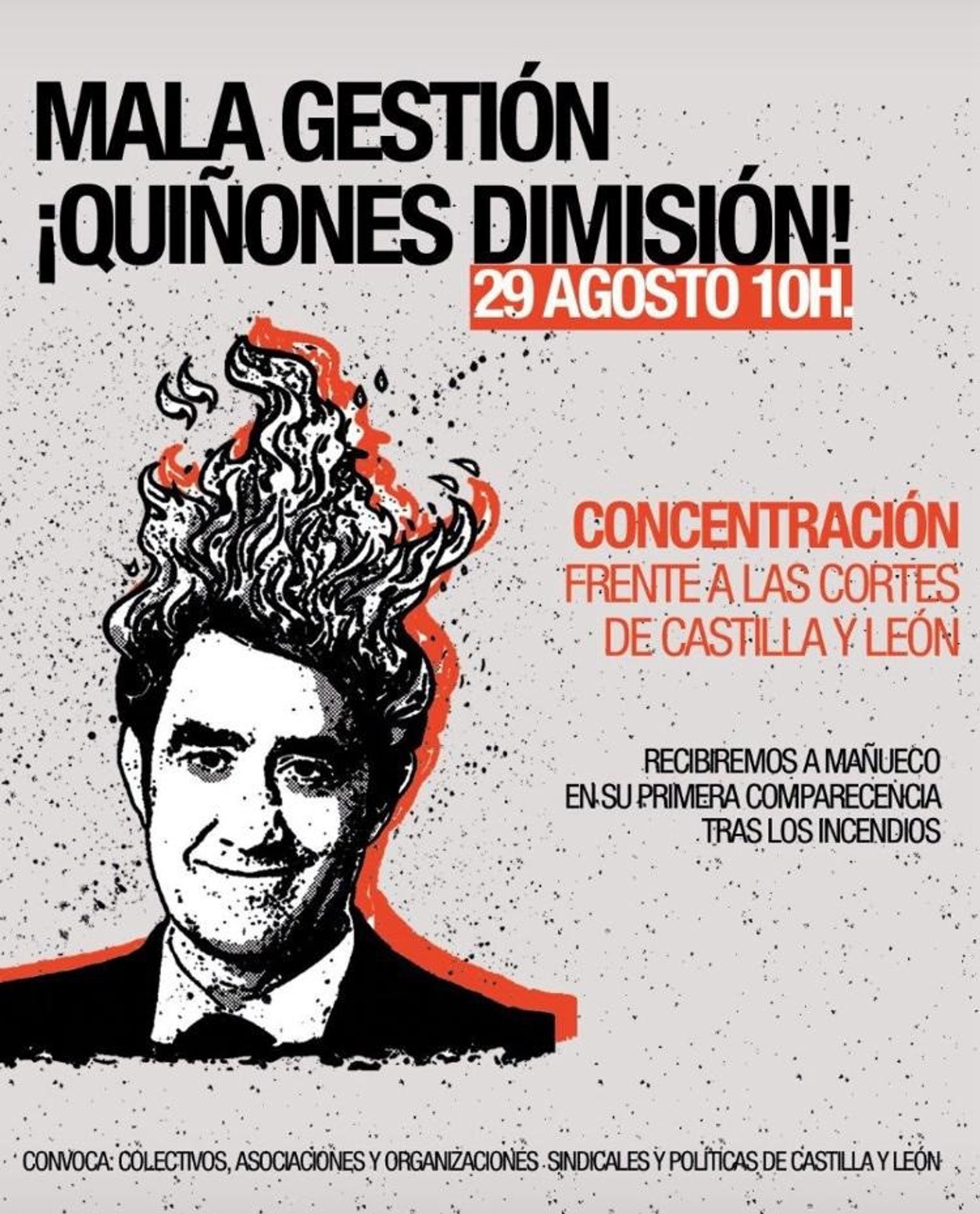 "Recibiremos a Mañueco en su primera comparecencia tras los incendios", recoge el cartel de la convocatoria, que sucede a otras que se han desarrollado en diversas ciudades y localidades para pedir responsabilidades por la gestión llevada a cabo con motivo de los incendios forestales que se han producido en la Comunidad.