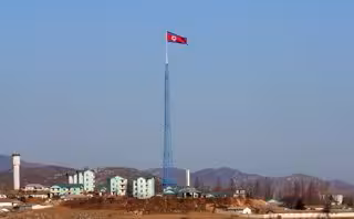 Una bandera de Corea del Norte ondeando sobre un edificio.