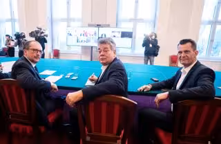 14 November 2021, Austria, Vienna: (L-R) Austrian Chancellor Alexander Schallenberg, Vice Chancellor Werner Kogler and Health Minister Wolfgang Mueckstein attend a coronavirus crisis summit with the government and provincial governors via videoconferenc - Georg Hochmuth/APA/dpa