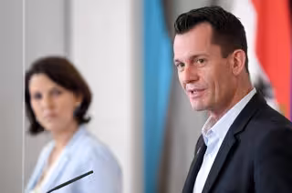 30 November 2021, Austria, Vienna: Karoline Edtstadler (L), Federal Minister for the EU and the Constitution at the Austrian Chancellery, and and Health Minister Wolfgang Mueckstein attend a press conference after the end of a round table on compulsory - Roland Schlager/APA/dpa