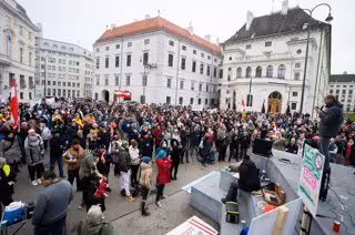14 November 2021, Austria, Vienna: People take part in a protest at Ballhausplatz against the authority's lockdown measures for unvaccinated people. Photo: Georg Hochmuth/APA/dpa