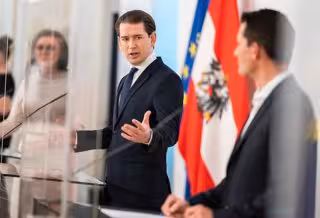 05 May 2021, Austria, Vienna: Austrian Chancellor Sebastian Kurz (C) speaks during a press conference following a cabinet meeting at the Federal Chancellery. Photo: Georg Hochmuth/APA/dpa