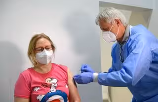 27 May 2021, Brandenburg, Potsdam: Doctor Christoph Borch gives a woman a shot of a Coronavirus vaccine at the Babelsberg Vaccination Center in the Metropolishalle. Beforehand, the Digital Vaccination Card was presented during a press event. Experience