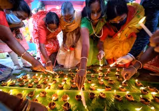 24 October 2020, India, Kolkata: Hindu devotees wear face masks as they light oil lamps, also known as Diyas, in front of Lord Durga idol during the Sandhi Puja Ritual of the Durga Ashtami festival. Photo: Avishek Das/SOPA Images via ZUMA Wire/dpa - Avishek Das/SOPA Images via ZUMA / DPA