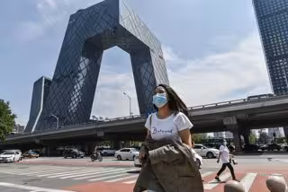 Archivo - 23 July 2021, China, Beijing: A woman walks near the China Central Television (CCTV) building at the international trade area of Beijing. China has strongly rejected plans by the World Health Organization (WHO) to take a closer look at a labor