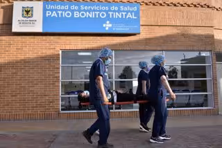 Cuatro sanitarios llevan en camilla a un paciente en Bogotá durante un ensayo de cara al comienzo de las vacunaciones contra el coronavirus en el país, que empezarán el próximo 20 de febrero. - GUILLERMO LEGARIA/GETTY IMAGES