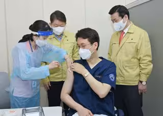 03 March 2021, South Korea, Daegu: A medical worker receives a shot of the Pfizer coronavirus (COVID-19) vaccine at a hospital in Daegu, 300 kilometers southeast of Seoul. Photo: -/YNA/dpa