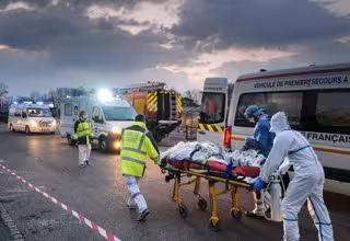 Archivo - 29 March 2020, France, Mulhouse: Emergency medical personnel transport a patient infected with the coronavirus from a military hospital to an ambulance to be transferred to another hospital by a TGV high-speed train. Photo: Sebastien Bozon/AFP - Sebastien Bozon/AFP/dpa - Archivo