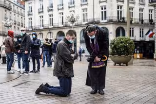 15 November 2020, France, Nantes: A Catholic priest listens to the confession of a believer during a gathering to call the reopening of places of worship as the national lockdown in France counties to stop the spread of the coronavirus. Photo: Sebastien - Sebastien Salom-Gomis/AFP/dpa