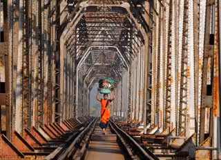 12 November 2020, India, Mumbai: A woman carries luggage as she walks along the railway track. Photo: Ashish Vaishnav/SOPA Images via ZUMA Wire/dpa - Ashish Vaishnav/SOPA Images via / DPA