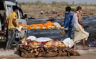 27 April 2021, India, Prayagraj: Family members and paramedics carry the bodies of victims who died who died of Covid-19 disease to the cremation sites at Phaphamau Ghat. India hit record numbers of Covid-19 infections worldwide for the sixth day runnin
